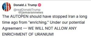 او در این پیام با انتقاد از جو بایدن، رییس جمهور پیش از خود نوشت: امضای خودکار، (اشاره به بایدن)، باید مدتها پیش جلوی غنیسازی اورانیوم ایران را میگرفت. در توافق احتمالی ما، اجازه هیچگونه غنیسازی اورانیوم نمیدهیم.