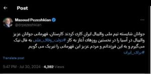 مسعود پزشکیان در توئیتی قهرمانی تیم ملی والیبال جوانان ایران در رقابتهای والیبال قهرمانی پسران زیر ۲۰ سال ۲۰۲۴ آسیا را تبریک گفت.
