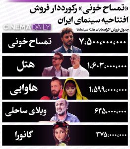 با آغاز اکران نوروزی سینماها فیلم کمدی «تمساح خونی» به کارگردانی جواد عزتی یک هفته زودتر از بقیه اکرانش را آغاز و با ثبت آمار فروش هفت میلیارد و پانصد میلیون تومان در سه روز اول اکران رکورددار فروش افتتاحیه سینمای ایران شد.این در حالی است که سینماها در این مقطع سال همواره شاهد رکود و افت فروش بودند و به نظر میرسد امسال این روند تغییر کرده. «تمساح خونی» همچنین ۱۱۰ هزار مخاطب در سه روز نخست اکرانش داشت.