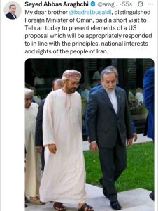 سید عباس عراقچی در خصوص سفر کوتاه وزیر خارجه عمان به تهران نوشت: برادر عزیزم آقای بدر البوسعیدی، وزیر محترم امور خارجه عمان، امروز در سفر کوتاهی به تهران عناصر پیشنهادی آمریکا را ارائه داد که بر اساس اصول، منافع ملی و حقوق مردم ایران به آن پاسخ مقتضی داده خواهد شد.